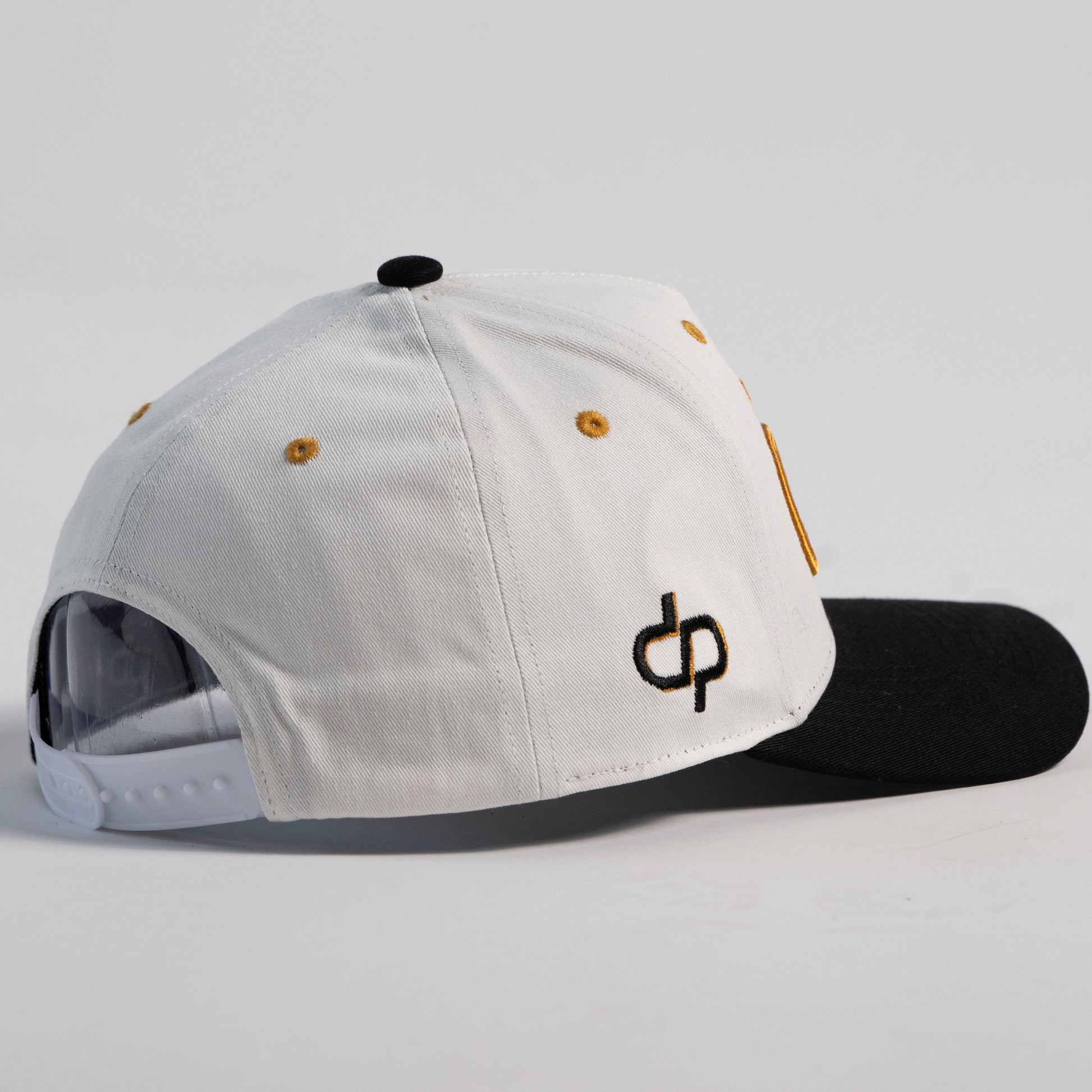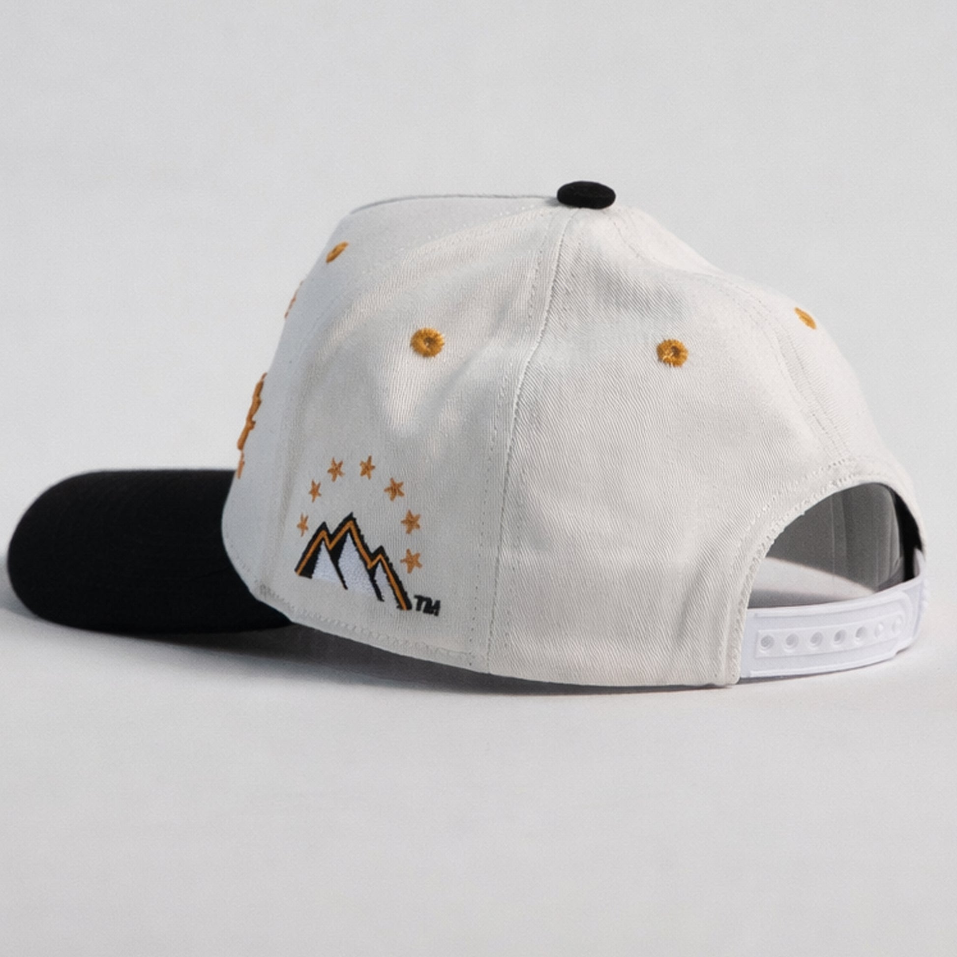 • Color: Off-white crown with black brim and black, gold, and white embroidery accents